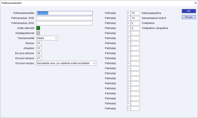 | Kortin aktivointi K/E | Tällä valinnalla määritellään kortin käyttöön tai pois käytöstä. Jos et joskus halua jotain keräilyä palkkalaskelmille, merkitse sellaiselle kortille Kortin aktivointi E. |