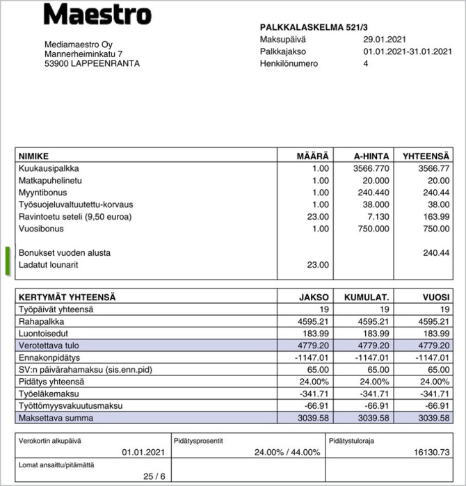 Alla palkkalaskelmalla näkyviä palkkanauhatietoja - "Bonukset vuoden alusta" ja "Ladatut lounarit".