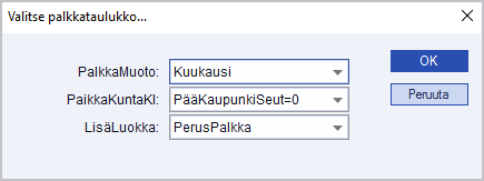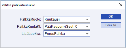 Valitse Tiedosto/Palkat/Yleistiedot/Palkkataulukot. Valitse sopiva palkkataulukko.