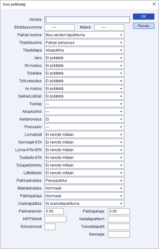 Muista merkitä myös oikea Palkkamuoto, eli kuukausi tai tunti. Kun kirjaat palkansaajalle palkkoja, palkkaohjelma hakee perustamallesi palkkatapahtumalle hinnan palkkataulukosta. Jätä henkilökortin peruspalkkakenttä tyhjäksi, jos haluat palkan summan tulevan peruspalkkataulukosta. Ohjelma laskee palkan peruspalkan mukaan taulukkopalkan sijaan, jos olet syöttänyt peruspalkan henkilökortille sekä valinnut palkkalajille palkkaehdotuksen peruspalkkataulukosta. Lisänä maksettava taulukkopalkka muodostuu aina palkkataulukon summin riippumatta henkilökortin peruspalkkakentässä olevasta summasta.