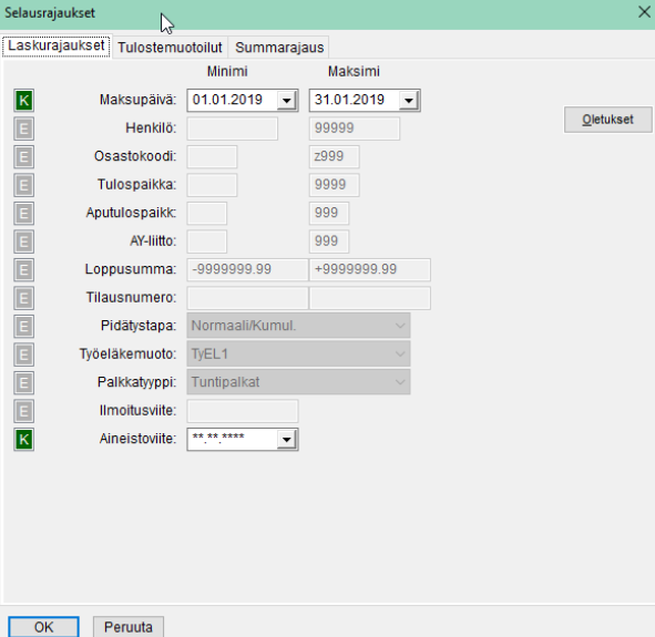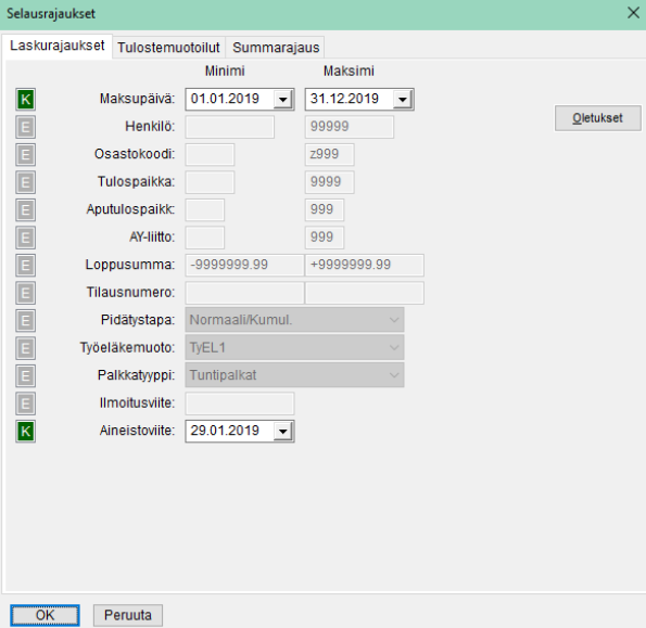 Jakson palkat -selauksessa on kaksi rajausehtoa Laskurajaukset -välilehdellä.