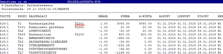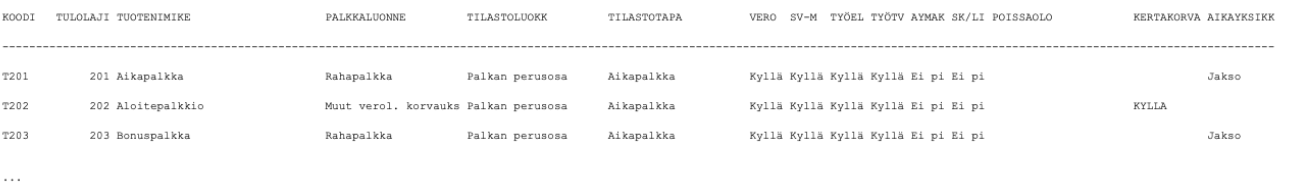 Jos Jakson palkat -selauksessa Tulostemuotoilut -välilehdellä valitaan Oletusraporteista Tapahtumaerittely, jolloin palkkalajeihin liittyvät tulolajit näkyvät listalla, esimerkiksi alla TL201 tarkoittaa tulolajia 201.