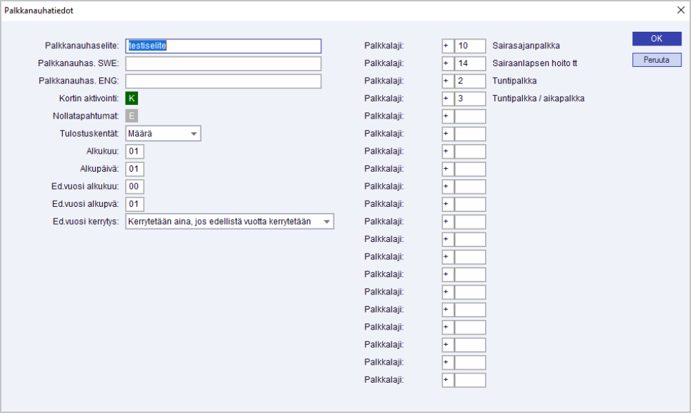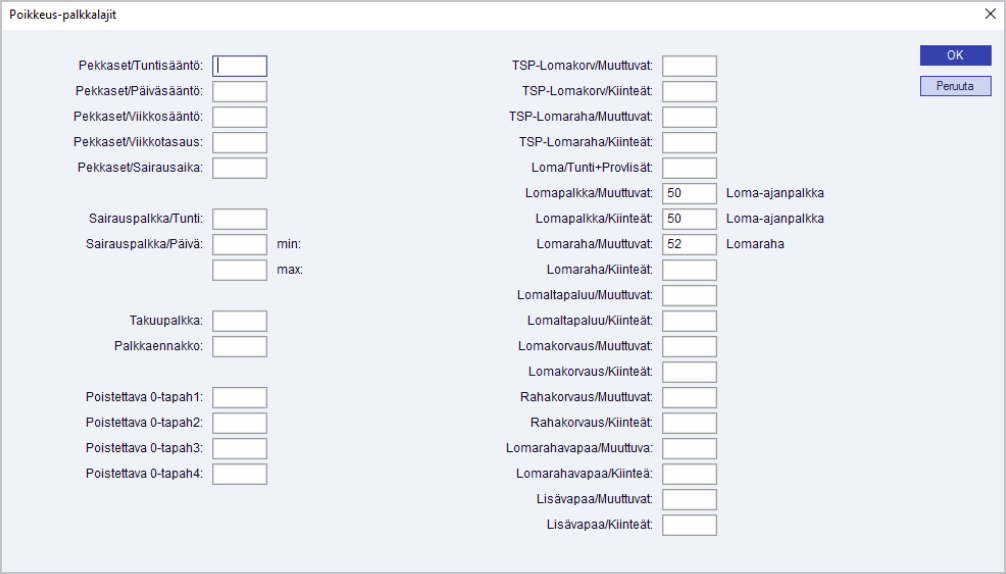 Tällä valinnalla määritellään erilaiset poikkeuspalkkalajit, esimerkiksi Työajan lyhennysvapaat, Sairauspalkka, TSP-Lomakorvaus.