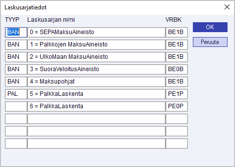 Tällä valinnalla määritellään laskusarjatiedot.
