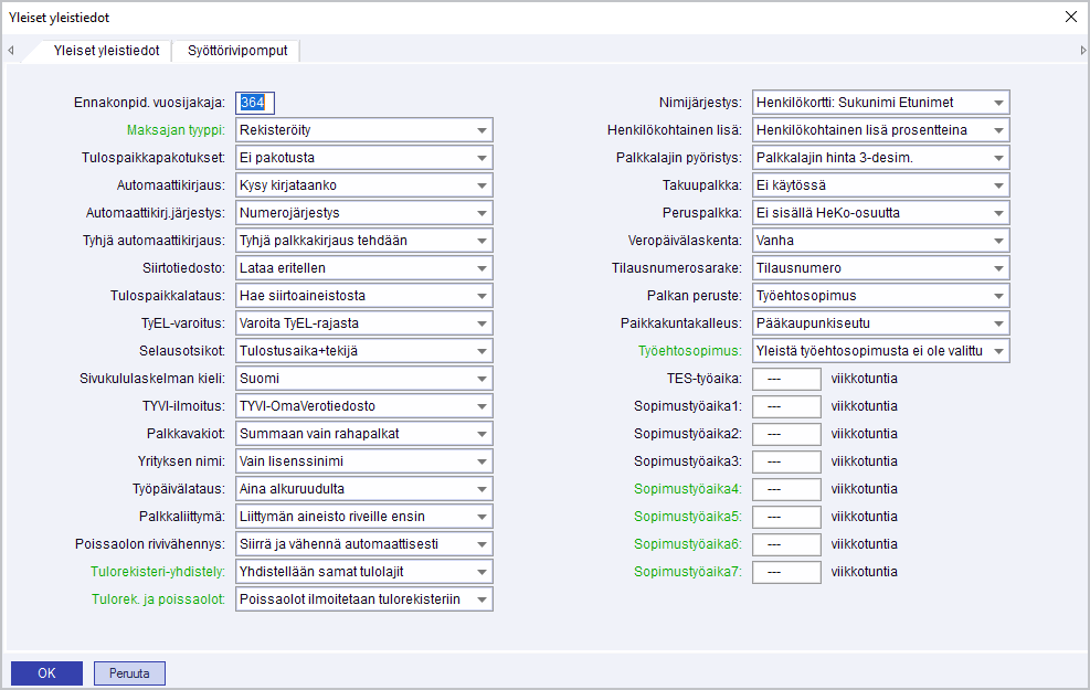 Tällä valinnalla määritellään esimerkiksi ennakonpidätyksen vuosijakaja, tulospaikkapakotukset, TyEL-Varoitukset, selausotsikot sekä syöttörivipomppujen tiedot.