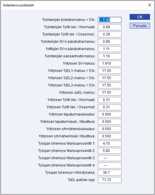 Tällä valinnalla määritellään vuosittaiset kalenterivuositiedot, esimerkiksi työeläkemaksu-, työttömyysvakuutus, SV-maksuprosentit.