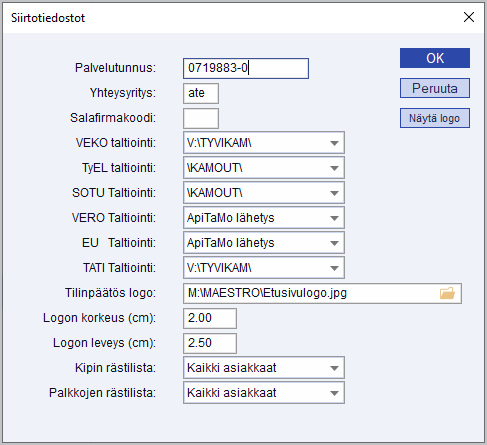 Siirtotiedostomääritykset koskevat kaikkia saman ympäristön (saman levyaseman - esimerkiksi F:) - yrityksiä. Jos jollekin yritykselle vaihdetaan esimerkiksi siirtotiedostojen taltiointiasetus, muutos vaikuttaa kaikkien yritysten asetuksiin. Tämä toiminta vaatii käyttäjältä SUPEROIKEUDET palkkoihin.