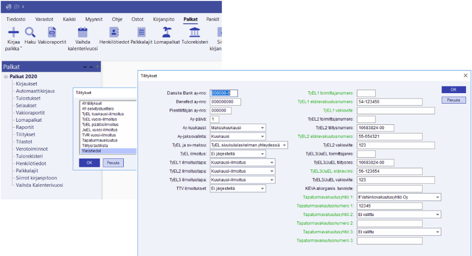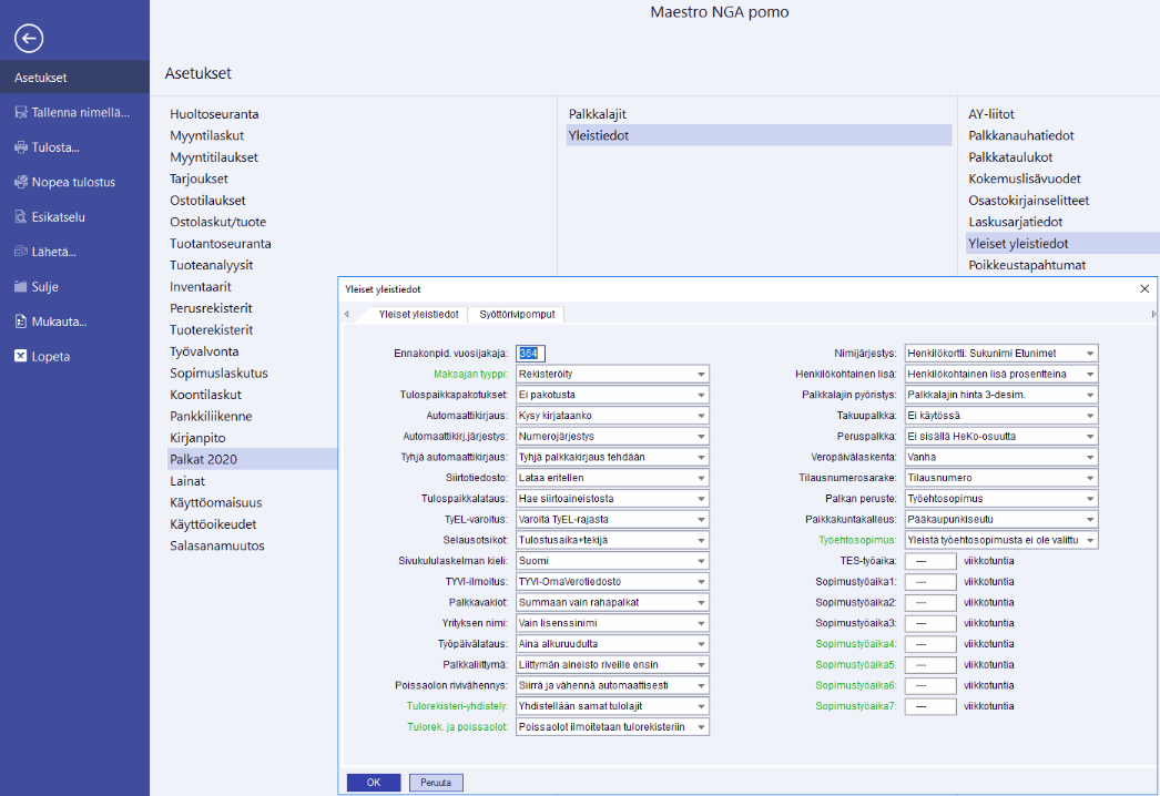 Valitse Tiedosto/Palkat 202x/Yleistiedot/Yleiset yleistiedot. Uudet kentät on merkitty vihreällä värillä.