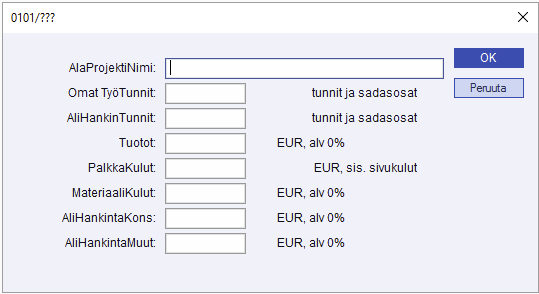 • AliHankintaTyötunnit-kenttään syötetään alaprojektille budjetoidut työtunnit tunteina ja tuntien sadasosina.