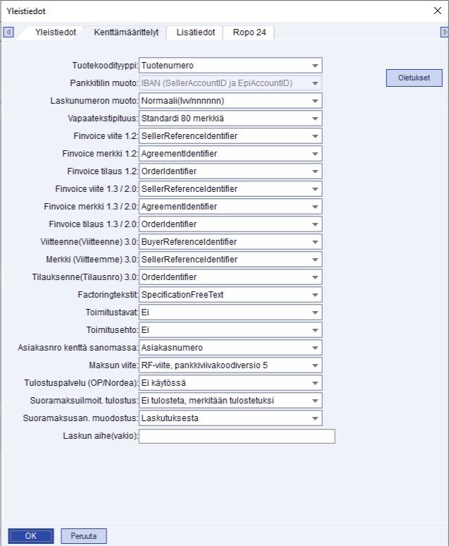 | Asiakasnro kenttä sanomassa | Tulostuuko asiakasnumerokenttään (BuyerPartyIdentifier) vastaanottajan OVT-tunnus, asiakasnumero, vanha asiakasnumero vai Y-tunnus. |