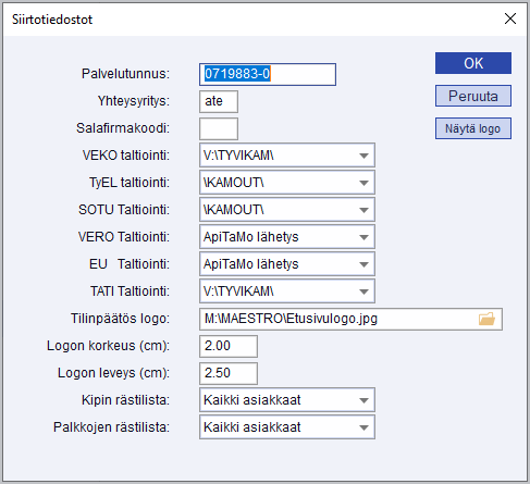 Ohjeessa kerrotaan, miten Maestroon määritellään OmaVero-ilmoitusten, verokorttien suorasiirron, EU-kaupan yhteenvetoilmoitusten ja EK:n työnantajatilastojen siirtotiedostojen tallennuskansiot. Lisäksi kuvataan palvelutunnuksen, yhteysyrityksen ja salafirmakoodin merkitys Tulorekisteri-ilmoitusten muodostamisessa sekä kansiovalintojen vaikutus kaikkien saman ympäristön yrityksiin. Ohjeessa selitetään siirtotiedostojen nimeämiskäytännöt, poistuneet toiminnot, ApiTaMo-lähetyksen erityispiirteet sekä tilinpäätöksen logon lisääminen ja sen mitoitus. Käyttäjän tulee valita oikeat kansiot taltioinnille, antaa tarvittavat Y-tunnukset sekä määrittää yhteysyritys ja mahdolliset rajoitukset asetusten muokkaamiseen.