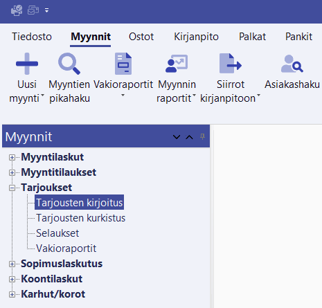- Tai valitse toimintovalikosta Myynnit, tämän jälkeen toimintopalkista Tarjoukset, ja sen alta Tarjouksen kirjoitus