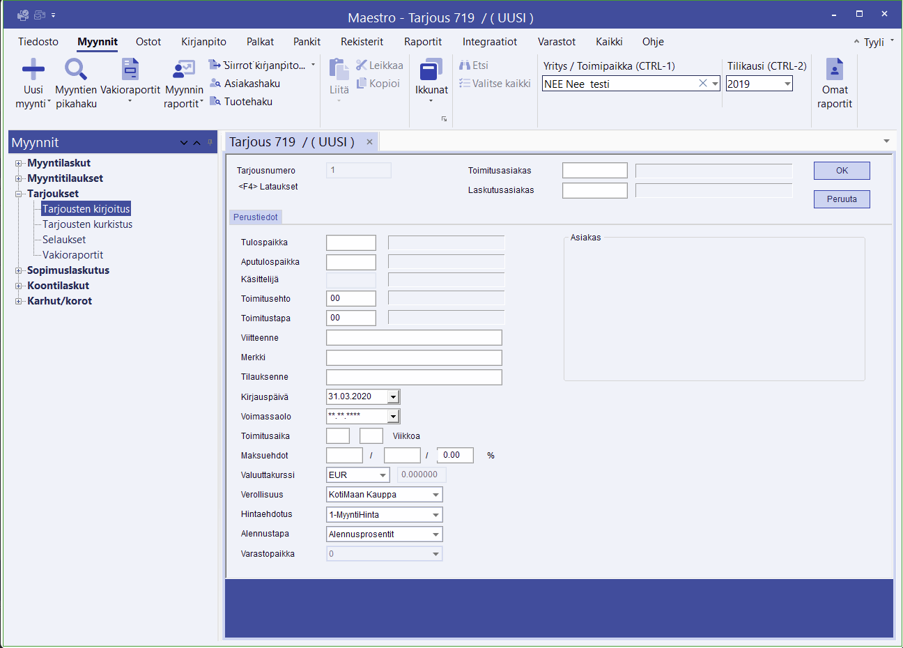 - Alkuruudulla täytät perustiedot, kuten asiakas- tai toimittajatiedot ja kirjauspäivän.