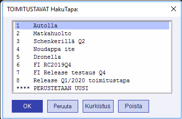 Tähän voit hakea toimitustaparekisteristä oikean toimitustavan, joka tulostuu lähetteisiin ja vahvistuksiin. Jos haluat kirjoittaa kenttään vapaata tekstiä, paina Ctrl + F2.