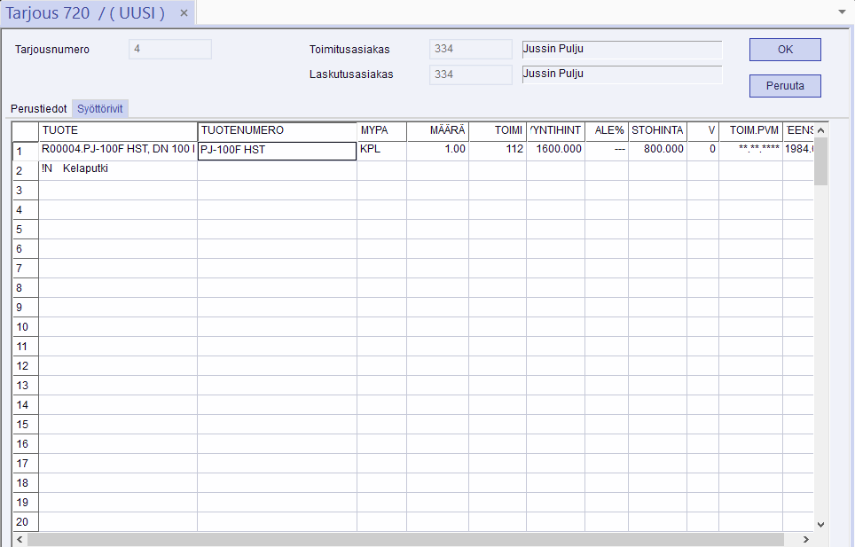 Toimitusosoitetiedot tulostuvat automaattisesti tarjouksiin. Toimitusosoitetiedot tulostuvat aina asiakaskortin Lähiosoite-kentästä. Laskutusosoitetiedot tulostuvat asiakaskortin Postilokero-kentästä, jos tiedot on sinne täytetty. Jos haluat muuttaa asiakkaan tietoja, siirry takaisin Toimitusasiakas- tai Laskutusasiakas-riville ja paina F10. Laskutusasiakkaan tietoja pääset muuttamaan mistä tahansa kentästä painamalla F7.