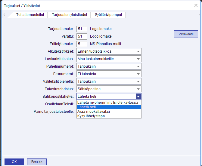Valinnalla Tulostusehdotus määritellään, onko tarjouksen oletustulosteena paperituloste vai sähköpostiin vienti. Valinnalla Sähköpostilähetys määritellään sähköpostin lähetysasetukset.