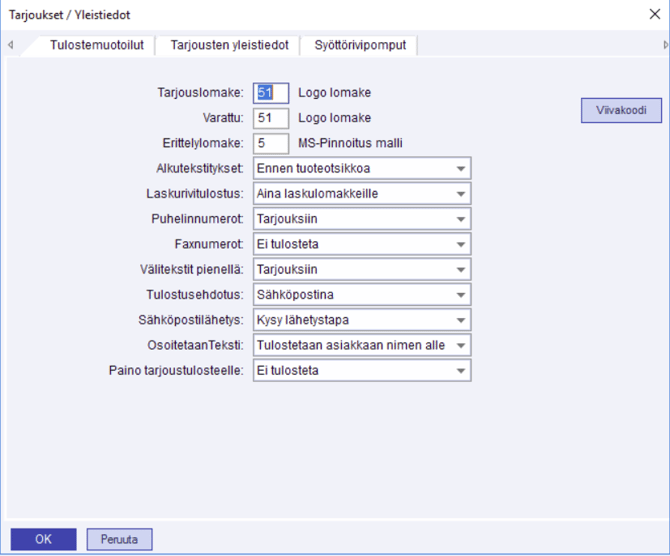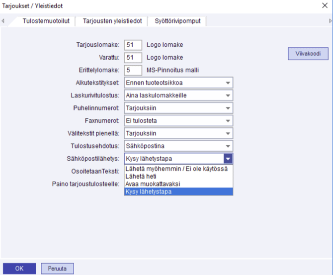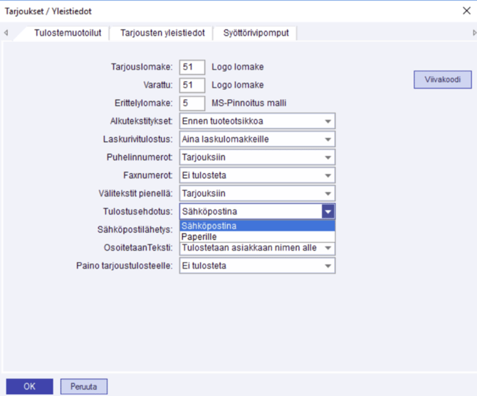 Tässä kentässä määritellään, tulostetaanko tarjoukset oletuksena paperille vai sähköpostiin.