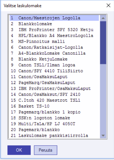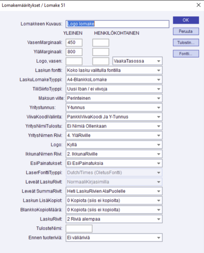 Käytettävän lomakkeen voi vaihtaa yksinkertaiseti vaihtamalla lomakkeen numeron. Valitun lomakkeen asetukset voi avata painamalla lomakenumerokentässä F10 tai klikkaamalla hiiren oikealla näppäimellä. Kun lomake on avattu, sen asetuksia voi myös muuttaa.