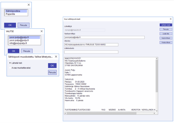 Mikäli asiakaskortin lisätietoriveiltä löytyy useampia sähköpostiosoitteita, kysyy Maestro tarjousta tulostettaessa, mihin osoitteeseen haluat sen lähettää.