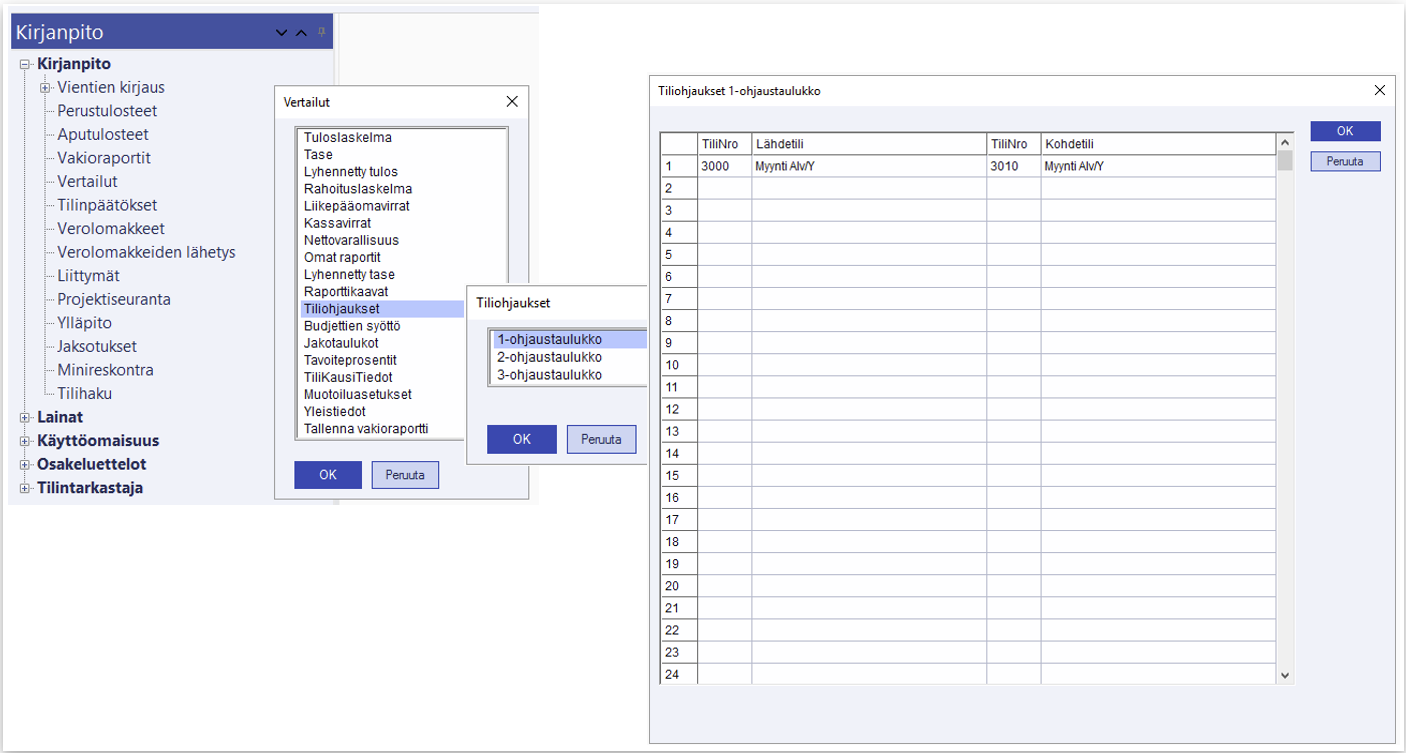 Voit syöttää kolme eri tiliohjaustaulukkoa. Käytettävään ohjaustaulukkoon otetaan kantaa kirjanpidon vertailujen yleistiedoissa valinnassa Ei käytetä ohjauksia - 1-ohjaustaulukko, 2-ohjaustaulukko, 3-ohjaustaulukko. Kun olet ottanut haluamasi vertailujen raportin ruudulle tiliohjauksilla, tallenna se vakioraportiksi. Näin ei tarvitse joka kerta määritellä erikseen käytettävää ohjaustaulukkoa.