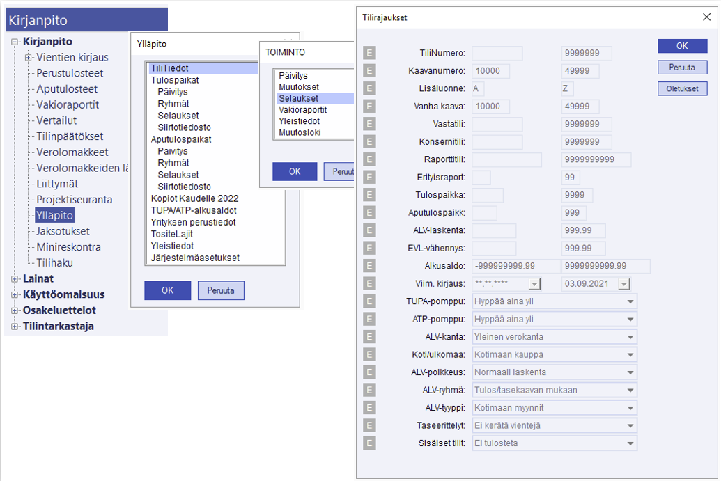 Valitse Kirjanpito/Tilitiedot/Selaukset.