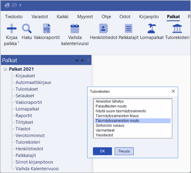 Valitse Palkat/Tulorekisteri/Täsmäytysaineiston nouto.