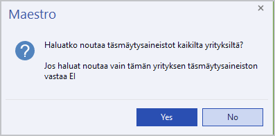 Jos yritykselle josta täsmäytysaineiston noutoa tehdään, on syötetty Yrityksen yleistietoihin palkanlaskijan käyttäjätunnus, tulee lähetyksessä kysymys halutaanko täsmäytysaineistot noutaa kaikilta omilta saman yhteysyrityksen yrityksiltä.