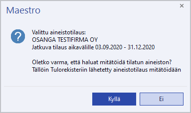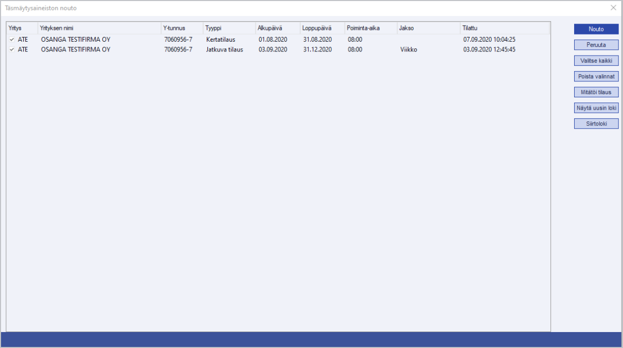 - ATE-yritykseltä listalla on myös jatkuva tilaus täsmäytysaineistosta, jonka Tulorekisteri muodostaa viikottain vuoden loppuun asti.