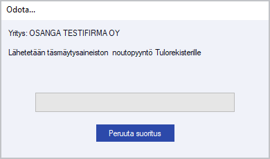 Kun halutut aineistot on valittu mukaan noutoon, nouda aineisto valinnalla Nouda. Tämän jälkeen Maestro noutaa aineistot yksi kerrallaan Tulorekisteristä, ja ruudulla näkyy toiminnon edistyminen.