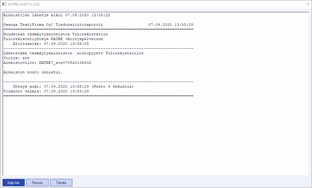 Noudon lopuksi täsmäytysaineisto avautuu selaimeen ja ruudulle avautuu siirtoloki, josta nähdään siirron onnistuminen jokaisen aineiston osalta. Loki sulkeutuu valinnoilla Sulje loki ja Peruuta. Valinnalla Tulosta lokin voi tulostaa. Noudon jälkeen aineistotilaus poistuu listalta, mikäli kyse oli kertatilauksesta tai vanhentuneesta jatkuvasta tilauksesta.