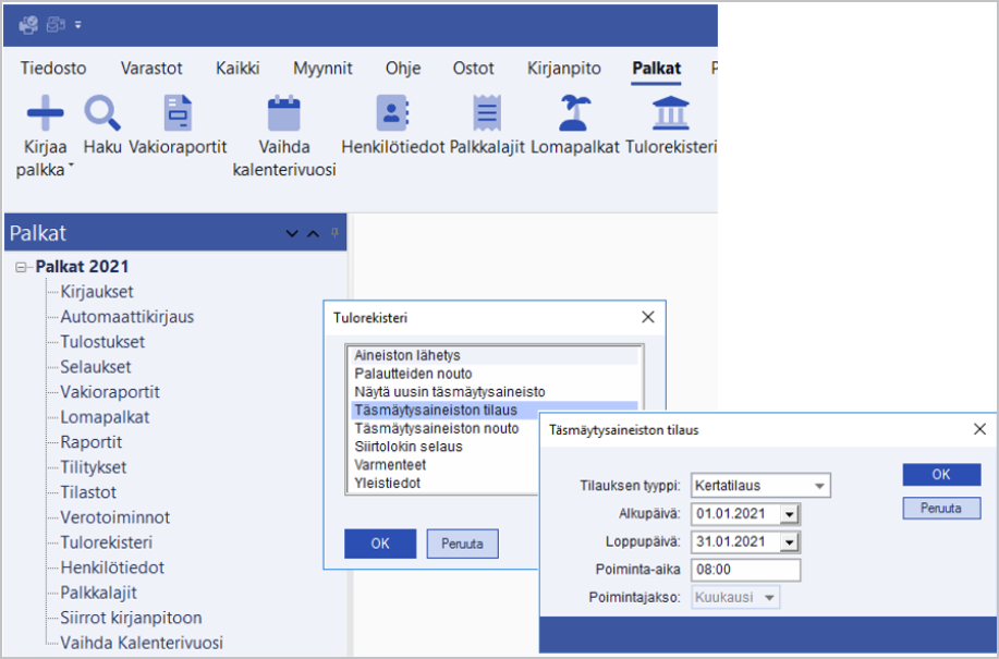 Valitse Palkat/Tulorekisteri/Täsmäytysaineiston tilaus.