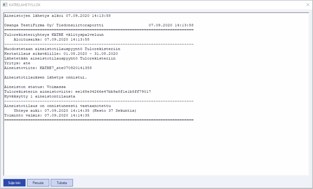 Lähetyksen lopuksi ruudulla näytetään loki lähetyksestä. Loki sulkeutuu valinnoilla Sulje loki ja Peruuta. Valinnalla Tulosta lokin voi tulostaa.