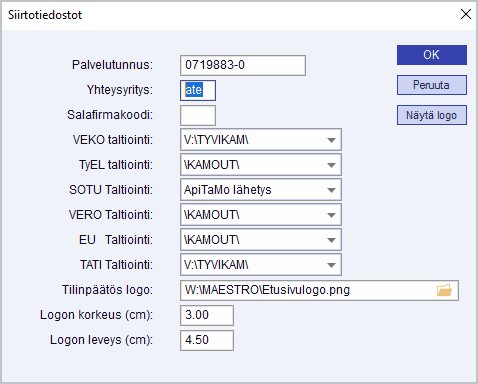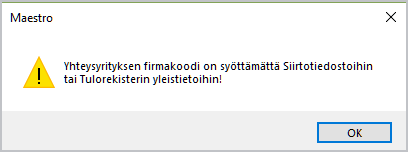 Yhteysyritys on se yritys, jolle haetaan Tulorekisterin varmenne ja minkä kautta ilmoitukset lähetetään. Kun yhteysyrityksen firmakoodi syötetään Siirtotiedostot -valintaikkunaan valinnalla Tiedosto/Palkat/Yleistiedot/Siirtotiedostot, on sama yhteysyritys käytettävissä Tulorekisteri-yhteyksissä samassa Maestro-ympäristössä olevilla kaikilla yrityksillä.