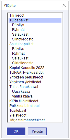 Tällä toiminnolla tehdään tulospaikkoihin, aputulospaikkoihin, tulosryhmiin ja aputulosryhmiin liittyvät määritykset. Projektiseuranta-ohjelmassa täällä määritellään myös projekteille alaprojekteja.Valitse Kirjanito/Ylläpito. Valitse sen jälkeen Tulospaikat tai Aputulospaikat, ja tämän jälkeen toiminto Päivitys, Ryhmät tai Selaukset.