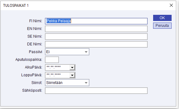Tällä valinnalla perustat uusia tai päivität olemassa olevia tulospaikkoja ja aputulospaikkoja. Halutessasi tietyn nimisen tulospaikan tai aputulospaikan määrätylle numerolle, valitse hakuikkunassa nimihaun sijaan numerohaku. Muutoin uusi tulospaikka perustetaan seuraavalle vapaalle numerolle. Tulospaikka-ikkunassa näkyvä AlkuPäivä-kenttä tarkoittaa ProjektiSeurannan projektin eli tulospaikan aloituspäivää, ja LoppuPäivä-kenttä projektin lopetuspäivää.