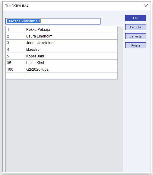 Valittuasi sen tulos- tai aputulosryhmän jota aiot päivittää - tai kohdan Perustetaan Uusi - saat ruudulle ikkunan, jossa päivitetään ryhmän tietoja. Ylimmälle riville tulee ryhmän nimi. Rivin alla oleviin kenttiin merkitään niiden tulospaikkojen tai aputulospaikkojen numerot, jotka haluat ryhmään mukaan. Jos ensimmäinen kenttä jätetään tyhjäksi, tulee myös nollatulospaikka mukaan ryhmään. Nollatulospaikalle menevät kaikki ne kirjaukset, joita ei ole kohdistettu millekään muulle tulospaikalle.
