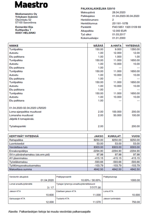 Alla esimerkki palkkalaskelmasta, joka on toimitettu Maestrosta Ropolle ja sieltä palkansaajan verkkopankkiin. Vastaavanlainen tuloste menee Roposta myös palkansaajan postilaatikkoon, mikäli palkansaajalla ei ole verkkopankkia käytössä. Säätämällä palkkatulosteiden yleistietoja, palkanlaskija voi vaikuttaa siihen mitä tietoja palkkalaskelmalle tulostuu. Tietojen näkyvyyteen vaikuttaa myös se, onko palkansaaja tunti- vai kuukausipalkkainen.