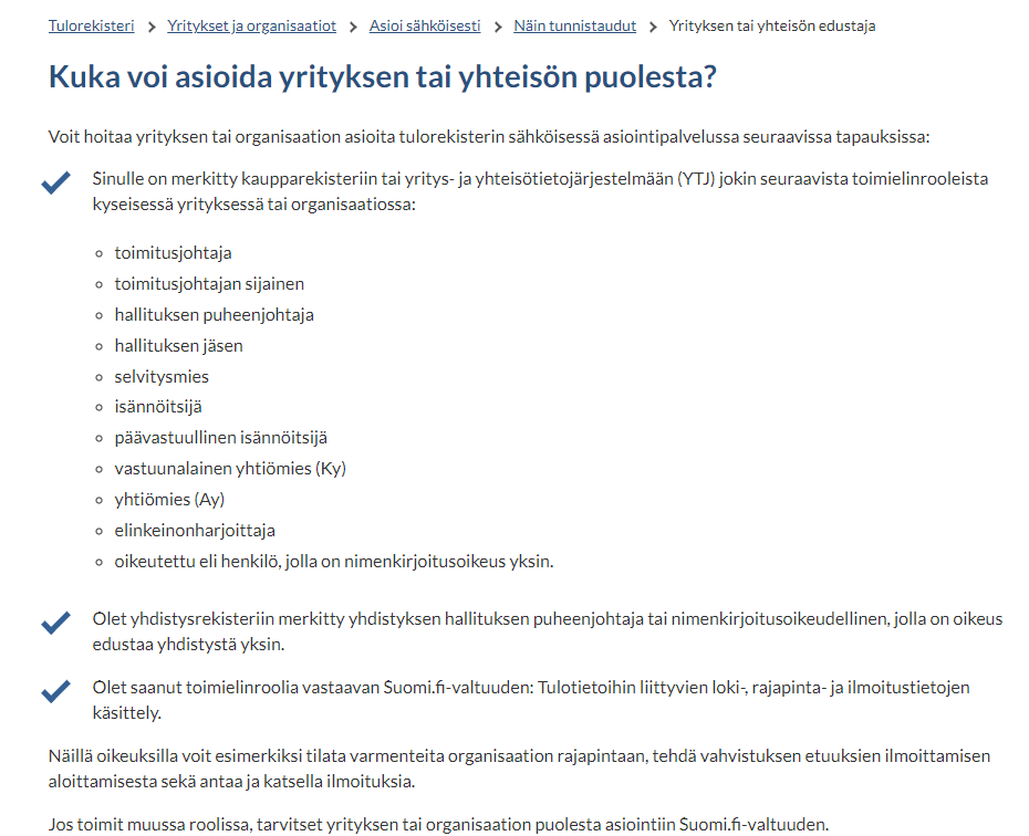 Henkilö, jolla on oikeudet asioida yrityksen puolesta tekee hakemuksen teknisen rajapinnan käyttöönottamiseksi. Ks. kuva oikeuksista alla. Tulorekisterin varmenne noudetaan Verohallinnon varmennepalvelun kautta: Varmennepalvelu - vero.fi