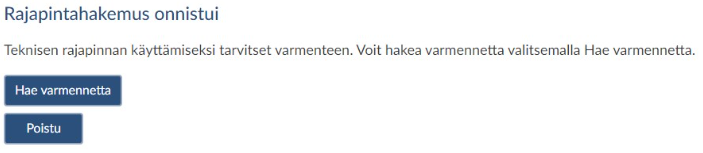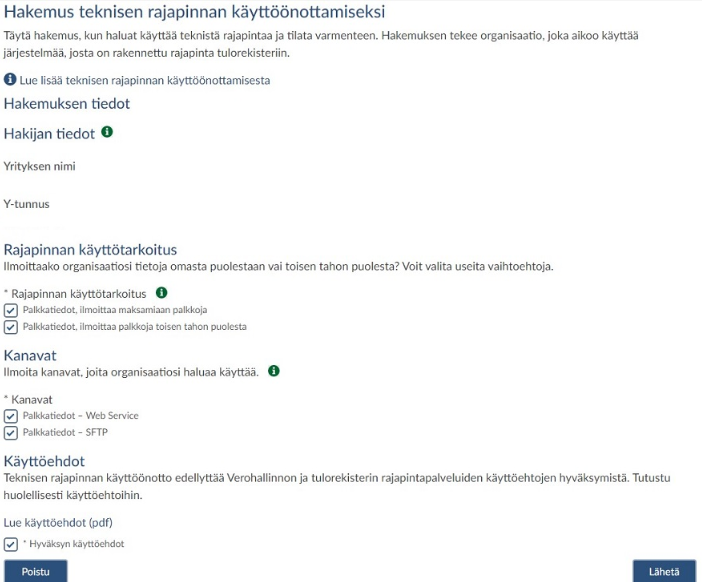 Tee hakemus teknisen rajapinnan käyttöönottamiseksi. Huomaathan, että varmennetyyppejä on kaksi - WS-varmenne ja SFTP-varmenne. WS-varmenteella hoidetaan mm. Verohallinnon ApiTamo-ilmoitusten ja Tulorekisteri-ilmoitusten tekeminen, virheiden korjaaminen ja palautteiden nouto, SFTP-varmennetta tarvitaan täsmäytysaineiston noutamiseen. Valitse Tulorekisteriä varten näistä kahdesta eri vaihtoehdosta molemmat. ApiTamo-käyttöönottoon riittää kuitenkin pelkkä WS-varmenne.