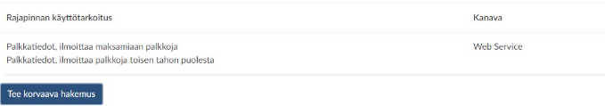 Hakemuksella voi hakea yhden varmenteen kerrallaan. Haetaan ensin Web Service -varmenne. Varmenteen tyypiksi valitaan Palkkatiedon tuottaja Web Service. Tämän jälkeen voidaan hakea SFTP-varmennetta, jos se on ennestään ollut rajapinnassa käytössä. Muutoin SFTP-varmenne saadaan haettua Tee korvaava hakemus -toiminnolla.