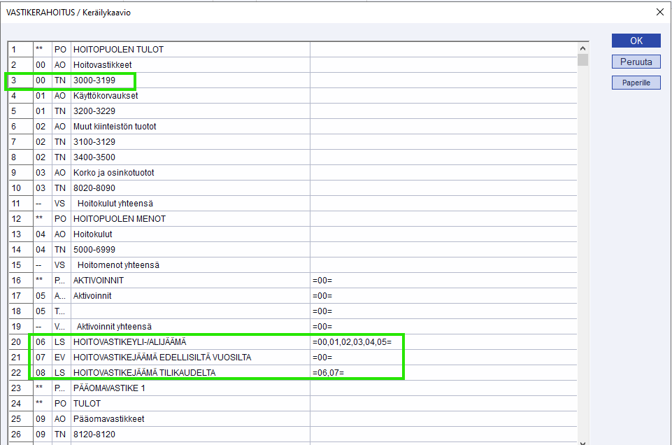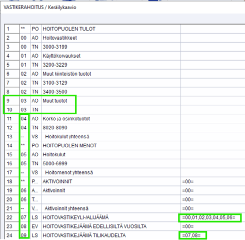 - 00 = osion kuuluvat rivit, AO= otsikko, TN= tilinumero, LS= yhteenlaskurivi