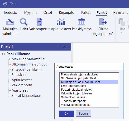 Valinnalla Pankit/Aputulosteet pankista tulleita vastaanottoilmoituksia voi selata aputulosteista Kuluttajan e-laskusopimukset ja Tiedonsiirtoraportit.