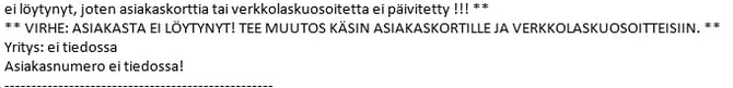 VIRHE: Asiakasta ei löytynyt! Tee muutos käsin asiakaskortille ja verkkolaskuosoitteisiin.