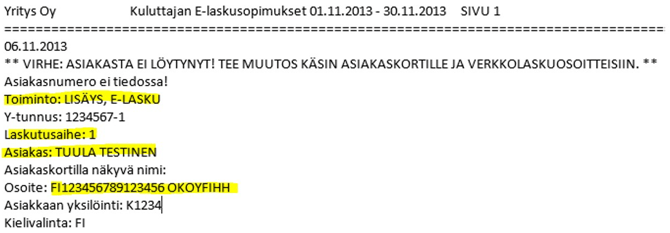 Kun tämä virhe on tiedonsiirtoraportilla, käy katsomassa Kuluttajan e-laskusopimukset. Siellä näkyvät ne tiedot, jotka asiakaskortille on käytävä muuttamassa.