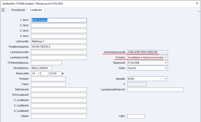 Tallennuksen jälkeen verkkolaskutustiedot näkyvät asiakaskortilla kohdissa Verkkolaskuosoite ja E-lasku: