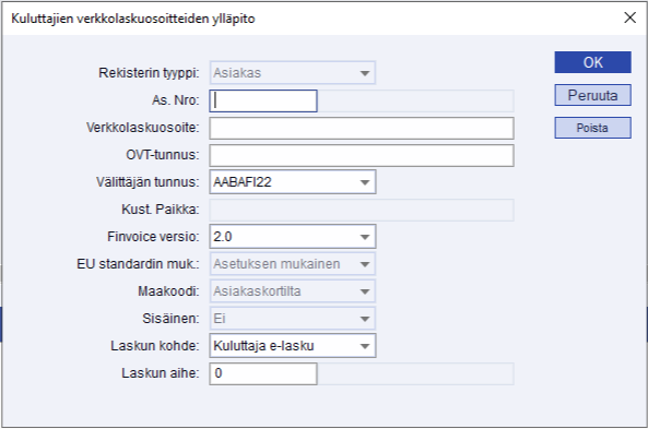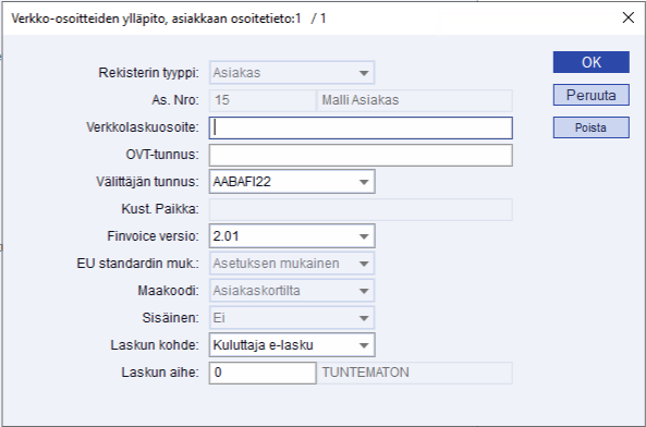 Avautuu verkkolaskuosoite kortti, jossa asiakas on jo valmiiksi määritettynä. Täydennettävä asiakkaan verkkolaskutustiedot: