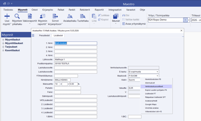 Tiedon asiakkaan maksutavasta voi päivittää myös asiakaskortilta. Valitse hiiren oikean painikkeella Verkkolaskuosoitteet / Kuluttajan e-lasku/suoramaksu