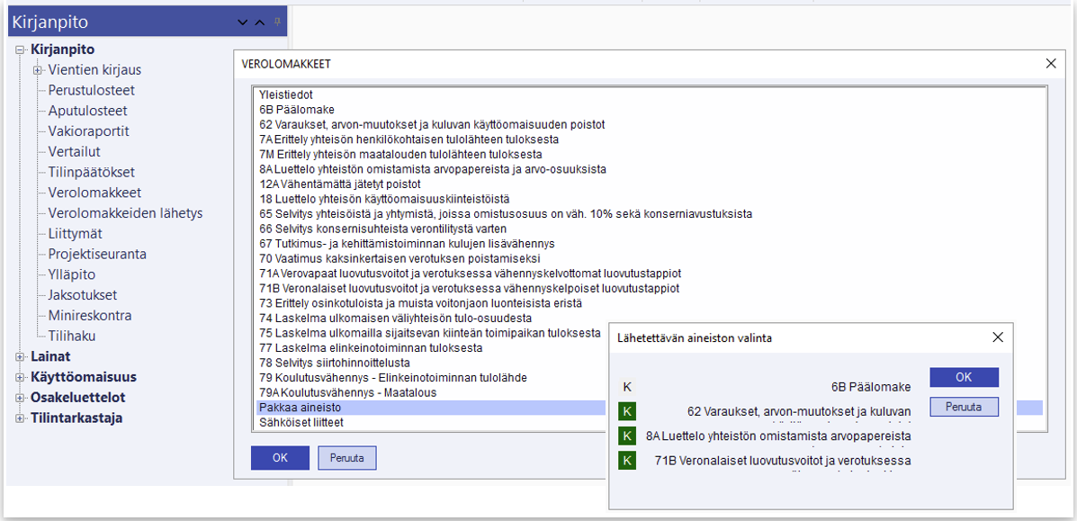 Valitse Kirjanpito/Verolomakkeet/Pakkaa aineisto. Muodosta tarvittavat lomakkeet - näistä päälomake aina ensin - ja pakkaa aineisto. Valitse sen jälkeen lähetettävä aineisto. Aineisto tallentuu odottamaan lähetystä.