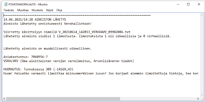 Aineiston oikeellisuus kannattaa tarkistaa tarkastusraportista ennen lähetystä. Kun aineisto on tarkastettu, voit lähettää aineiston. Saat vastaavan raportin myös aineiston lähetyksen onnistumisesta.