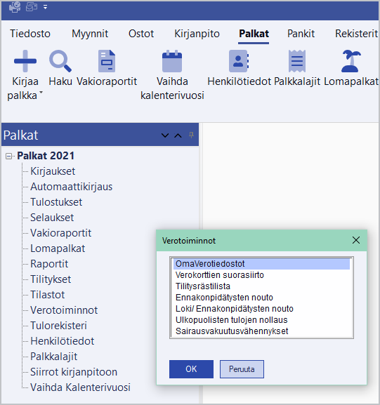 | Verokorttien suorasiirto | Palkansaajien verokorttitiedot voidaan siirtää suoraan verottajalta palkkaohjelmaan siirtotiedoston avulla. Tällä toiminnolla voit muodostaa verottajalle korttien pyyntöaineiston ja päivittää verokorttitiedot myöhemmin henkilökorteille. Tarkempi ohje verokorttien suorasiirrosta löytyy VEROKORTIT -toiminnon ohjeesta. |